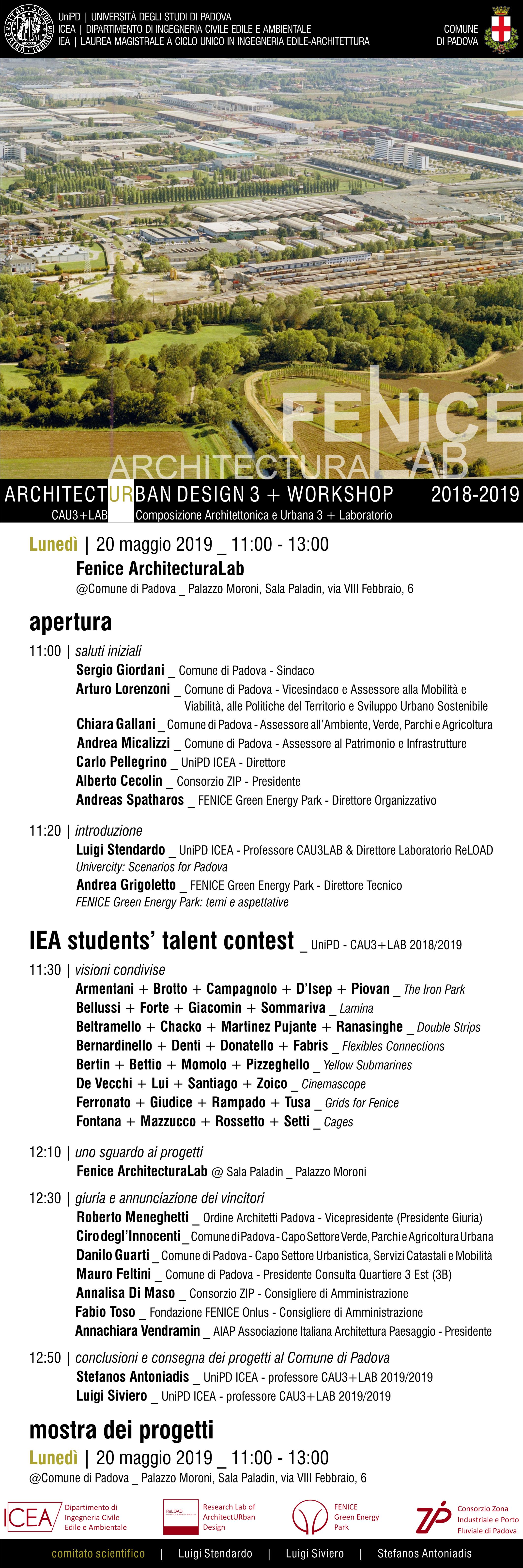 ReLOAD_Research Lab of Architecturban Design, e la programmazione didattica coordinata dal prof. Luigi Stendardo si misurano con il progetto urbano e di architettura scaturito dal confronto con interlocutori radicati nel territorio. In questi particolari casi, di fronte alla difficoltà di configurare delineare obiettivi, vincoli e processi, si chiede al progetto di architettura di mettersi in prima fila, per accendere visioni innovative che possano orientare le decisioni e sulle quali incrociare e coagulare interessi di diversi stakeholder: cittadini, amministratori, proprietari, gestori ed investitori. Nel caso del Corso di Composizione Architettonica e Urbana 3 con Laboratorio dell’anno accademico 2018/2019, il tema di progetto è stato proposto dalla Fondazione Fenice Onlus che gestisce il Parco Fenice (Green Energy Park) a Padova. Gli studenti sono stati invitati a formulare proposte innovative per uno sviluppo sostenibile del Parco Fenice e dell’adiacente Parco Roncajette (di competenza del Settore Verde, Parchi e Agricoltura Urbana del Comune di Padova, che è stato coinvolto nel workshop).