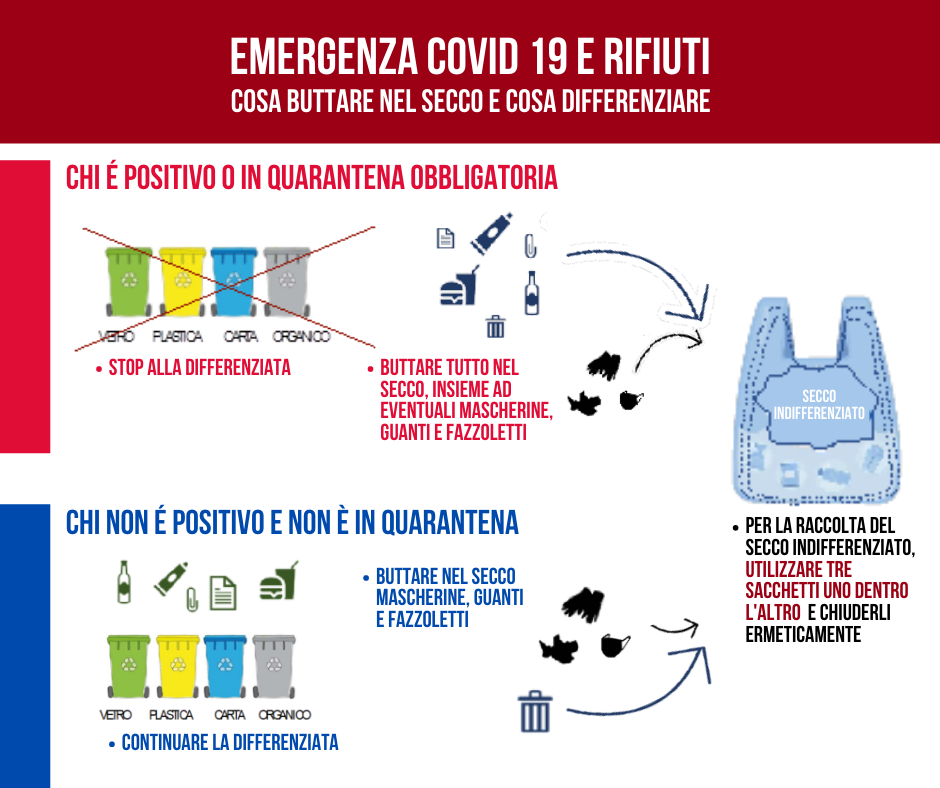 I rischi sanitari hanno poi comportato la sospensione della raccolta differenziata per le case in quarantena e nelle zone ad alto isolamento. La necessità di tutela degli operatori addetti alla raccolta, inoltre, sta portando a ridurre il loro numero, così che la raccolta differenziata viene spesso interrotta anche nelle zone a più bassa incidenza epidemica, dove non ci sarebbero motivi all’interruzione della raccolta differenziata.